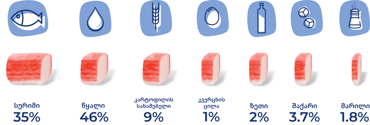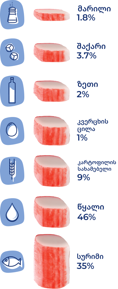 3–4 კგ ხარისხიანი თევზი სჭირდება მხოლოდ 1 კგ სურიმის მისაღებად, რაც სურიმის ბუნებრივ ზღვის პროდუქტების კონცენტრირებულ წყაროს წარმოადგენს. შედეგი? მსუბუქი, ჯანსაღი ნაჭერი, რომელიც ასევე გემრიელია და მკვებავი.